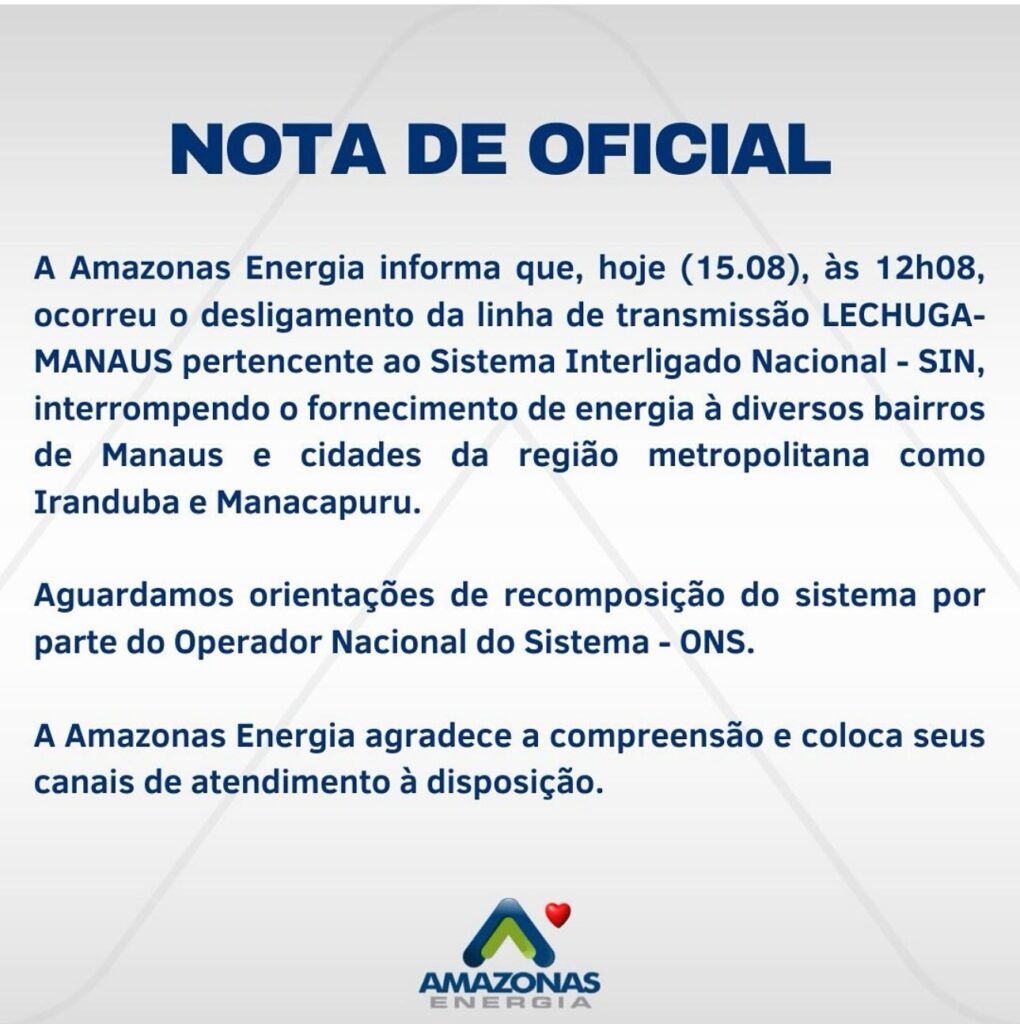 A Amazonas Energia informou que o desligamento da linha de transmissão LECHUGA-MANAUS, pertencente ao Sistema Interligado Nacional (SIN), ocorrido às 12h08, é a causa da interrupção no fornecimento de energia. A empresa aguarda orientações do Operador Nacional do Sistema (ONS) para a recomposição do sistema.