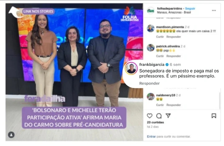 Um comentário sem respaldo em qualquer procedimento administrativo ou judicial, extrapolando o direito à liberdade de expressão, foi com base nesse entendimento que a Justiça do Amazonas condenou nesta quinta-feira, 16/7, o ex-prefeito de Parintins, Frank Bi Garcia, ao pagamento de danos morais à pré-candidata ao Governo do Amazonas pelo Partido Liberal, Professora Maria do Carmo.