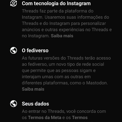 Na nova plataforma, os usuários podem fazer o login, configurar seus perfis e minibio e encontrar amigos por meio das contas do Instagram —que soma 2 bilhões de usuários no mundo atualmente. Os usuários que tiverem as duas contas conectadas vai ganha um ícone na bio do Instagram com o número de sua inscrição no Threads. O número ficou reservado para o dono da Meta, Mark Zuckerberg.