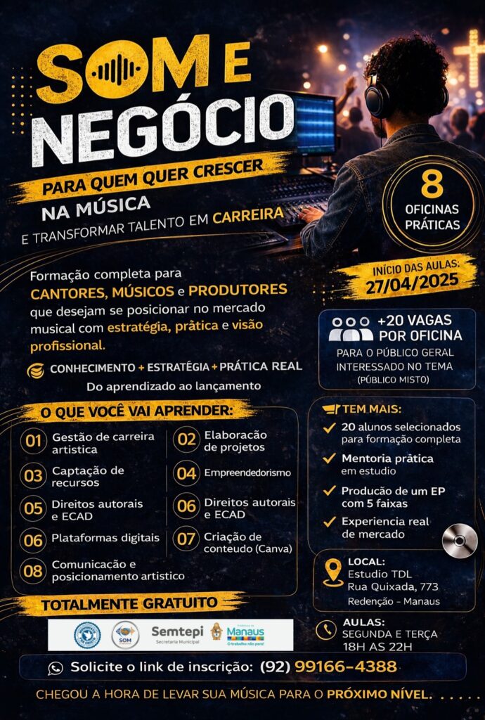 A Associação Movimento por Cristo está com inscrições abertas para dois programas gratuitos de formação profissional voltados ao fortalecimento da economia criativa em Manaus: o Programa Som e Negócio – Formação em Música e Empreendedorismo Cultural e a Mentoria Especializada em Produção de Eventos.