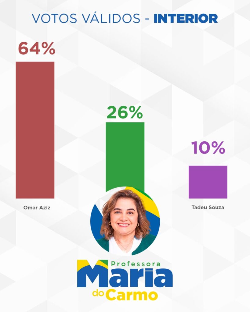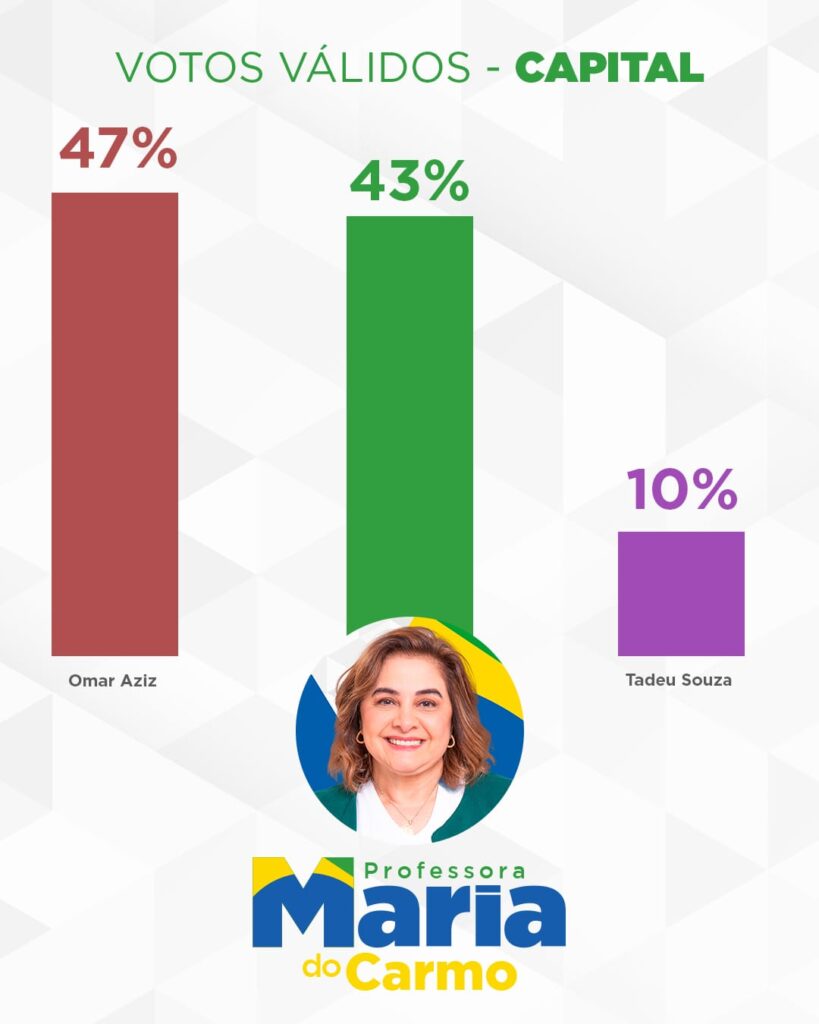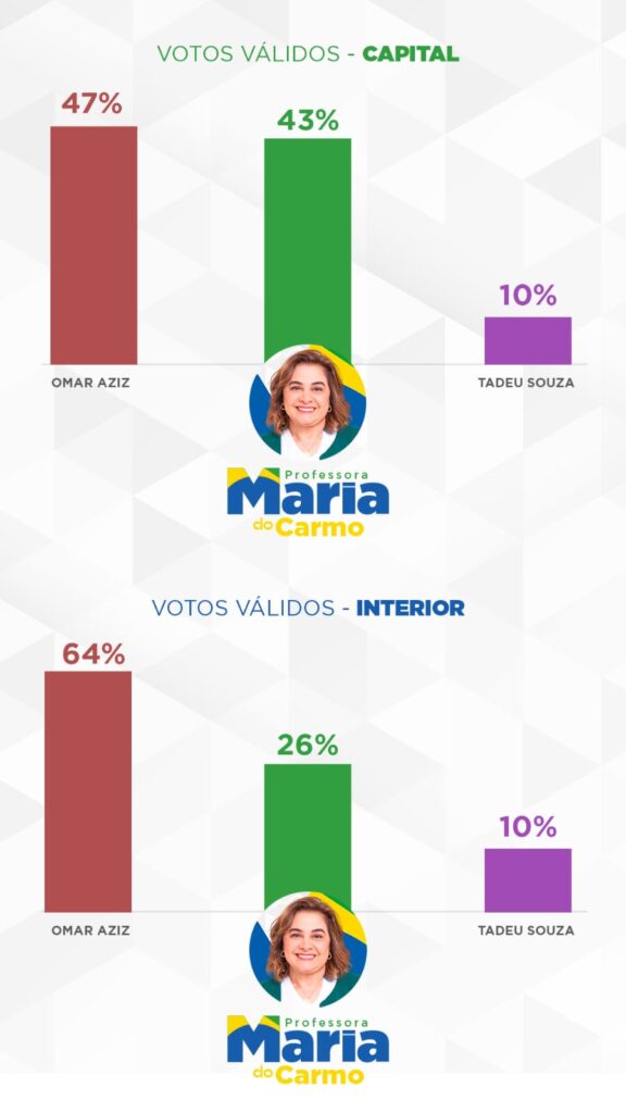 A pesquisa mostra um cenário estimulado com três opções de possíveis candidatos ao Governo do Amazonas em 2026. A Professora Maria do Carmo, mesmo sem nunca ter mandato e enfrentando a máquina pública, já aparece em segundo lugar, com 43% das intenções de votos válidos na capital e 26% no interior do Estado.
