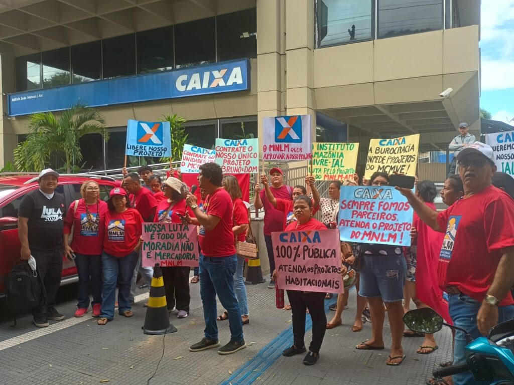 Na manhã desta segunda-feira (30), o centro de Manaus foi palco de um protesto pacífico que reuniu representantes de movimentos sociais de luta por moradia em frente à Caixa Econômica Federal, na Praça da Saudade.